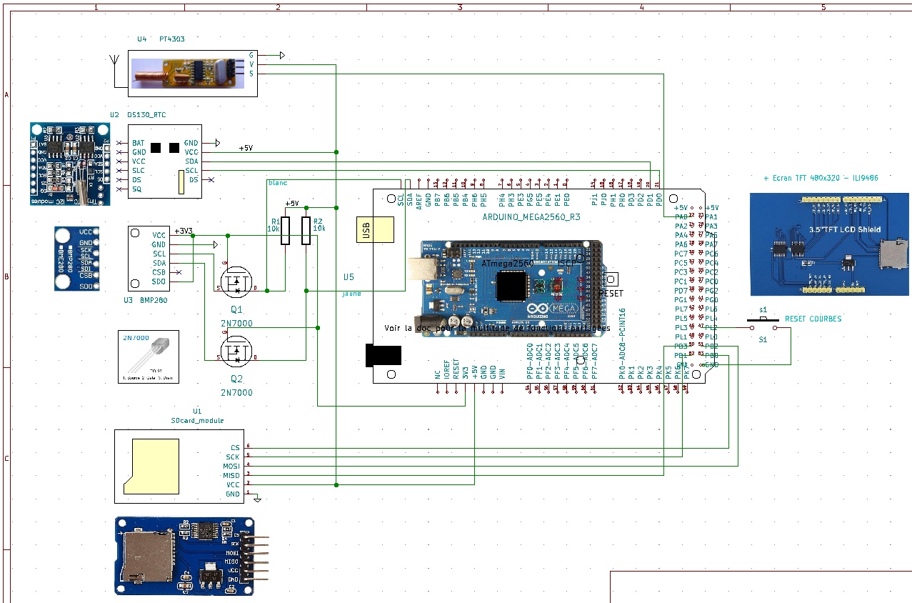 Sous la carte Arduino mega2560 se trouve une fine plaque en plastique sur laquelle sont fixés les différents capteurs. Tous ces capteurs sont reliés électriquement par des connecteurs, ce qui rend possible le démontage très simplement.
