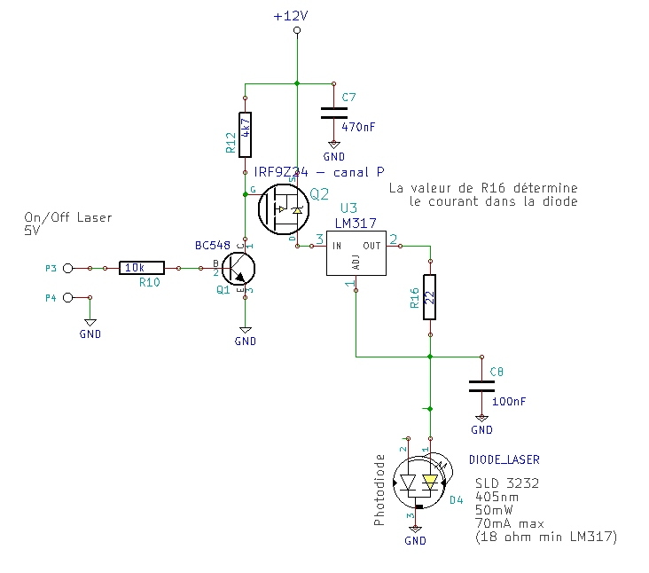 -Oui en effet on peut se contenter d'un simple LM317 en cms + une résistance, ce qui tient dans le boîtier cylindrique du laser. Mais celui que j'ai réalisé permet de régler la luminosité du faisceau précisément, avec un signal généré par le microcontrôleur, ce qui est nécessaire pour la photo-plotteuse . Et rien n'empêche de le réaliser lui aussi en cms ce qui le rendra beaucoup plus petit. Je ne l'ai pas fait parce qu'il me manquait certains composants en cms.