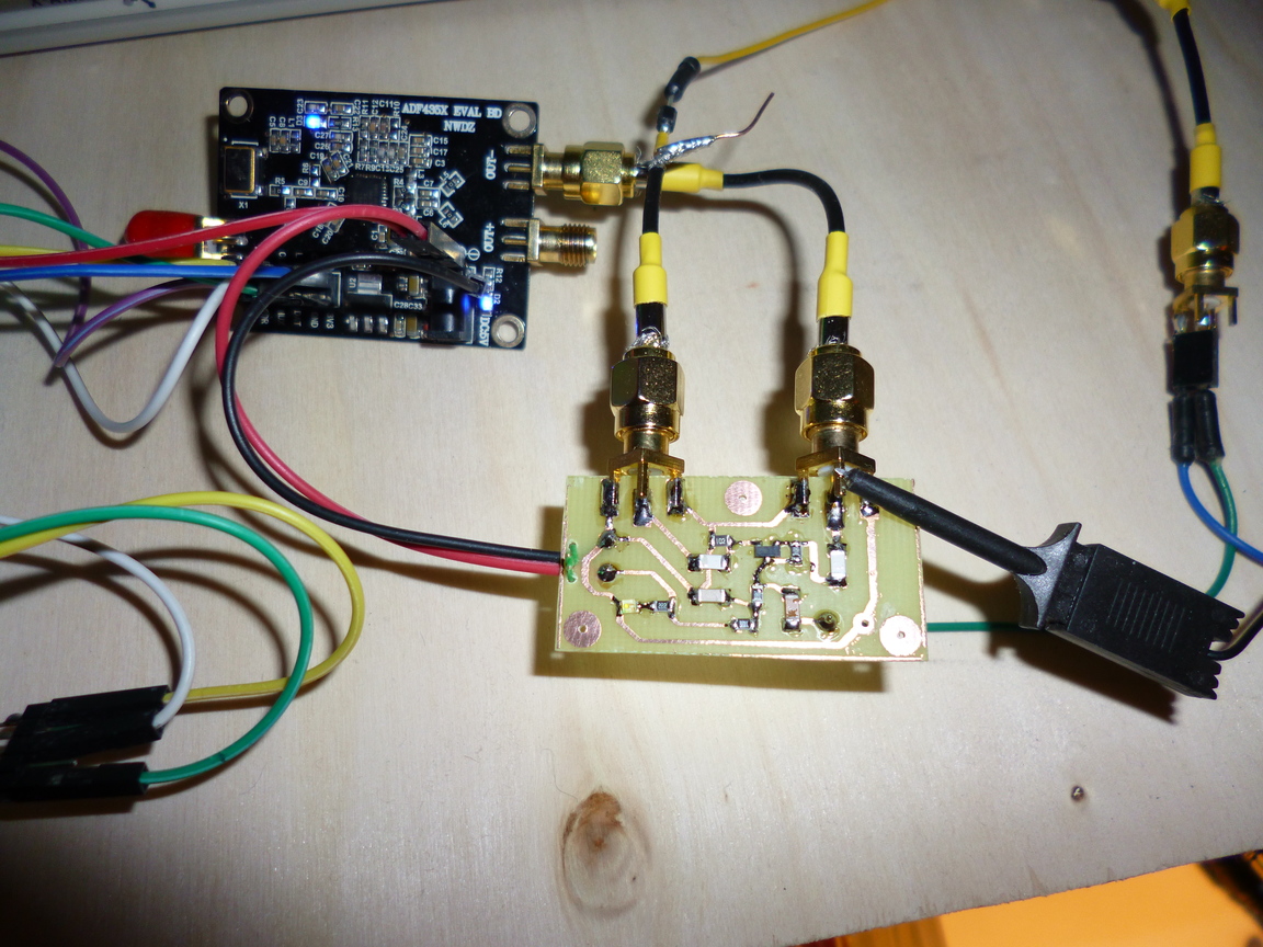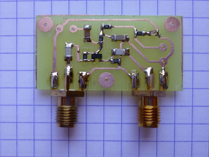 Ce mixeur utilise un simple transistor UHF BFR93A pour effectuer la multiplication des signaux de la bande 2.4GHz avec le signal d'un oscillateur local à 2 GHz. Il est basé sur le fait que le gain d'un transistor monté en émetteur commun dépend du point de fonctionnement. Il suffit donc d'appliquer le signal de l'oscillateur local, de forte amplitude, sur la base et le signal d'entrée de faible amplitude sur l'émetteur pour obtenir le produit désiré de l'un par l'autre, qui n'est autre qu'une modulation d'amplitude.